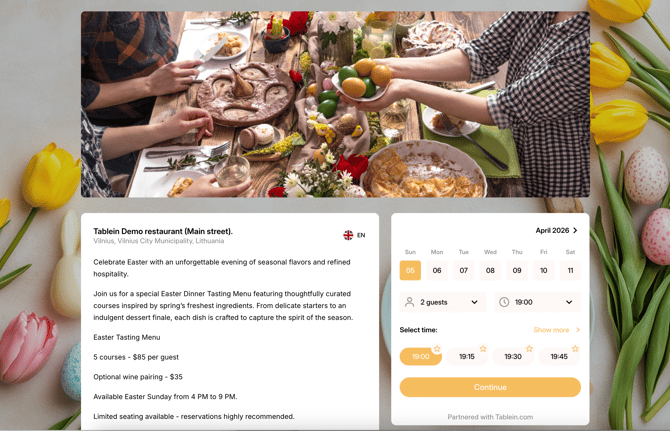Boost your bookings by creating dedicated landing pages for your upcoming events, degustations, and special offers. These pages are designed for immediate action, automatically redirecting guests to the first available event date to streamline the reservation process.