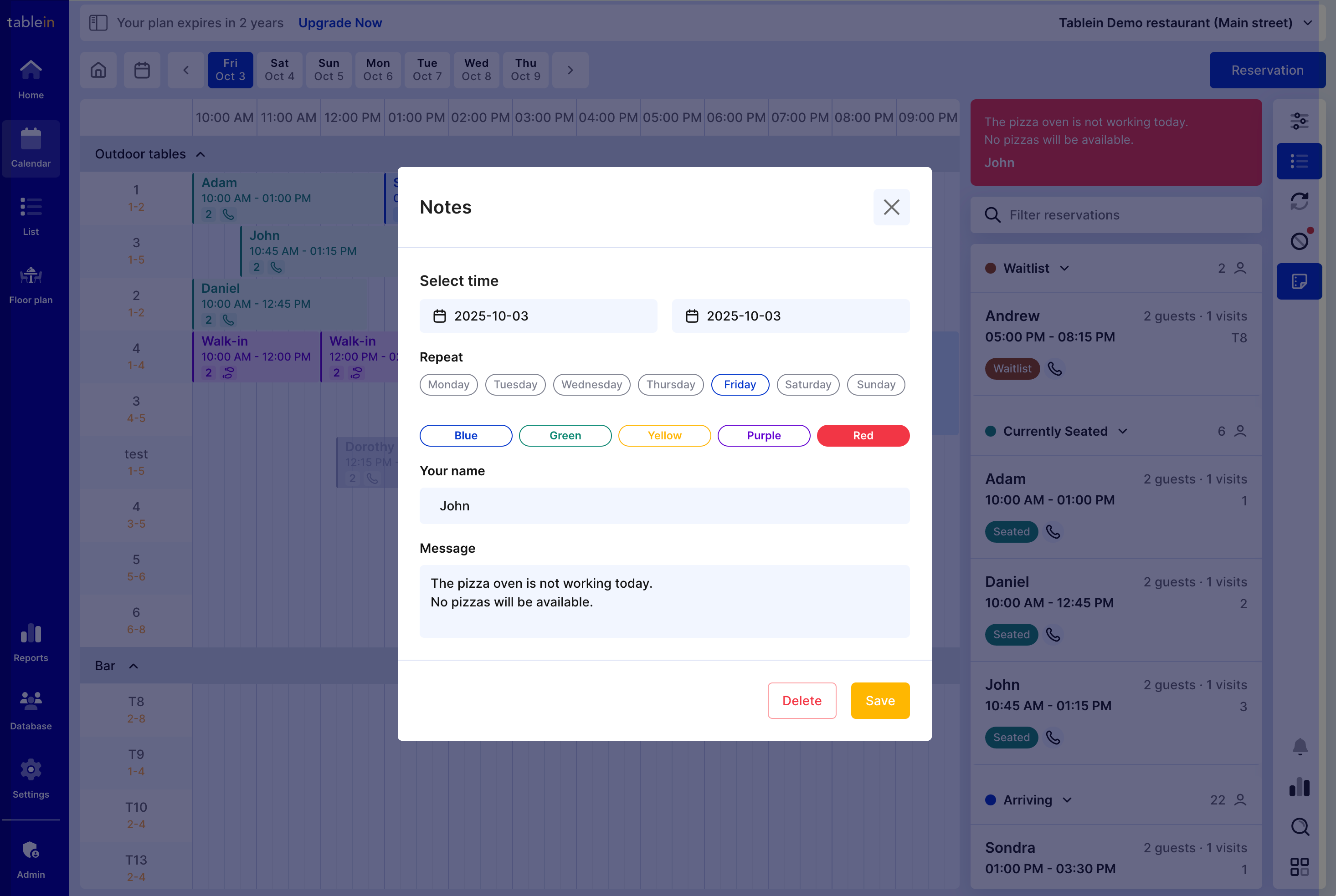 The Notes feature allows you to leave a message for your staff that will appear at the top of the reservation list for the selected day.