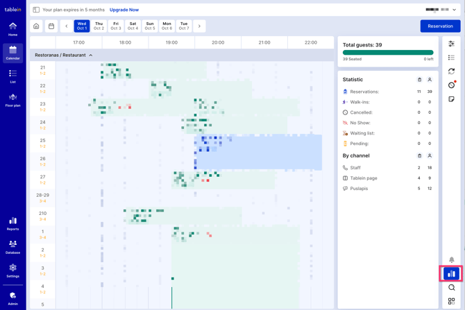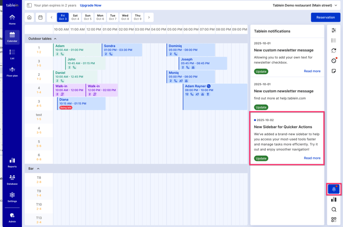 Click on the sidebar icon to collapse the Tablein menu and turn on the reservation list.