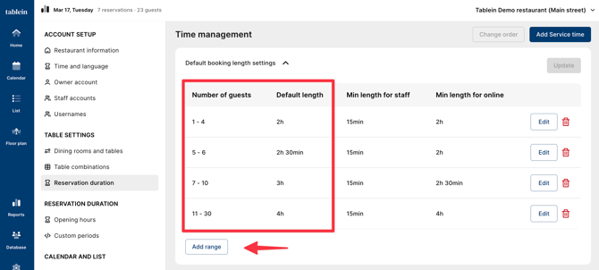 Edit the existing "1–99" rule to "1–4 guests" and set it to 2 hours.