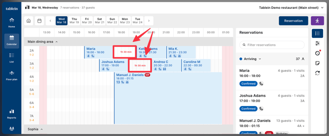Drag-and-Drop: Note that if you move a reservation manually on the floor plan, the duration remains fixed to what you manually set and will not auto-adjust based on guest count.