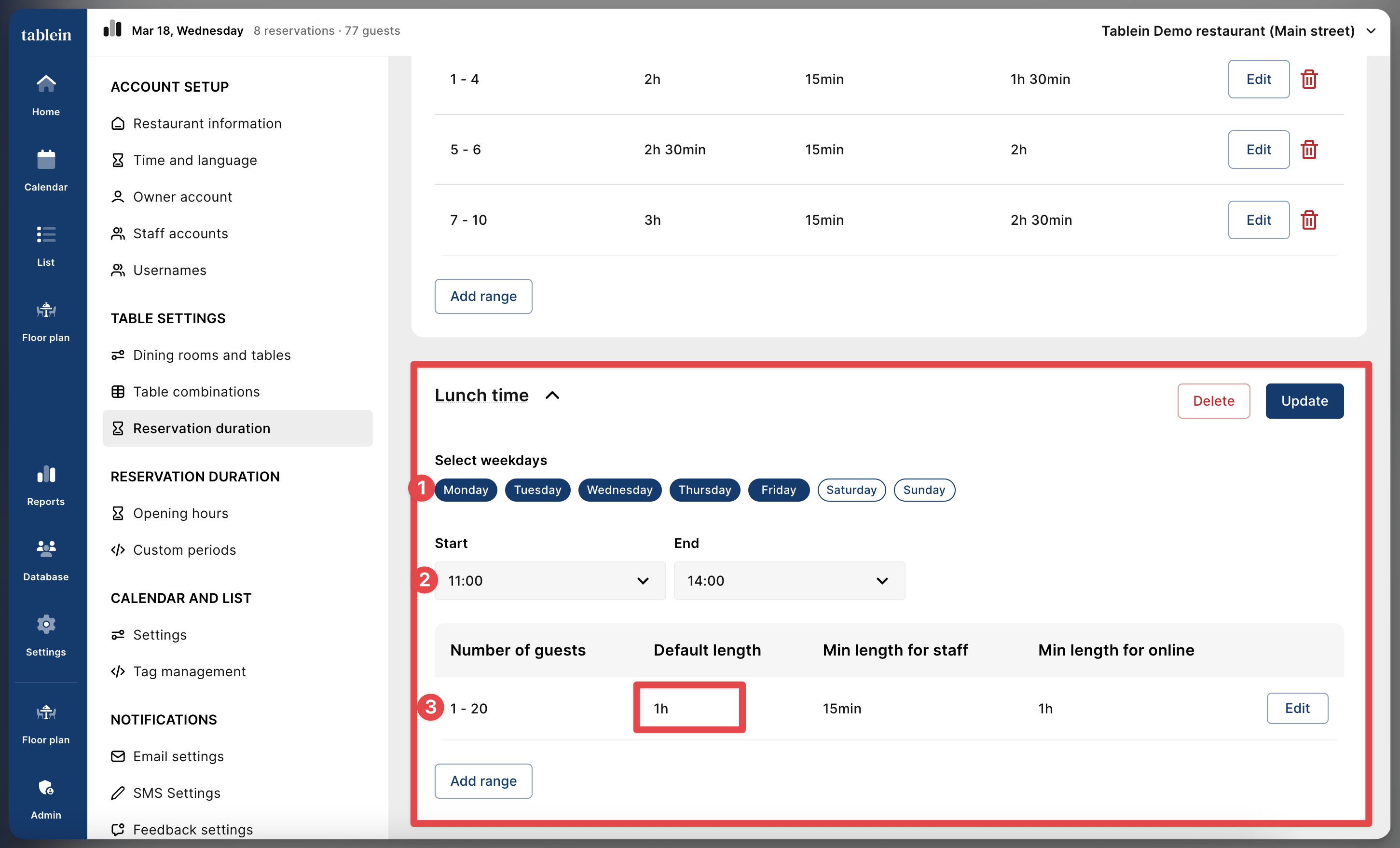 The system automatically adjusts how long a table is booked based on the number of guests. By giving larger parties more time and offering shorter slots during peak hours, you can maximize your daily turnover without rushing your guests.
